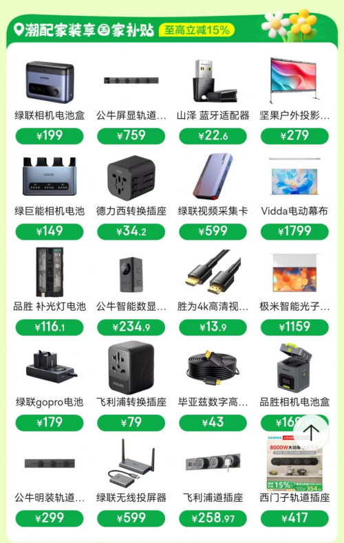 除买1赠1和限时5折外,在京东“潮配家装节”活动中,国家补贴优惠也不容错过。不仅是轨道插座,从电池盒到蓝牙适配器,再到无线投屏器等诸多产品均可享受国家补贴立减15%的优惠力度。其中支持快充、收纳、读卡等多项功能的绿联相机电池盒售价199元,叠加国家补贴15%优惠后到手价低至169.2元,公牛智能数显立式插座叠加国家补贴15%优惠后到手价低至199.7元。总的来看,无论户外还是室内,想要升级居家生活品质,来京东下单总能获得靠谱又划算的购物体验。