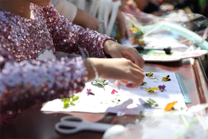 开园仪式上,丰富多彩的互动环节吸引了众多小朋友和游客参与。非遗植物拓染体验人气爆棚,孩子们和家长们一起,将各种植物的形状和色彩拓印在布料上,感受传统文化的魅力。