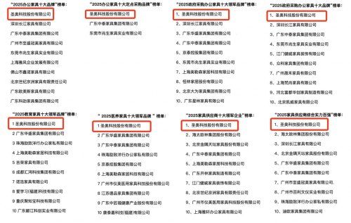 近日,由中国采购与招标网、中国名企排行网联合主办的“2025(第15届)家具招标采购评价推介活动”圆满落幕。经过两个多月的严格评审,圣奥凭借卓越的综合实力和良好的市场口碑,荣登“2025办公家具十大品牌”“2025办公家具十大定点采购品牌”“2025政府采购办公家具十大领军品牌”“2025政府采购办公家具十大品牌”“2025教育家具十大领军品牌””2025医养家具十大领军品牌”“2025家具供应商十大领军企业”“2025家具供应商综合实力百强”八项榜单,再次彰显了在行业内的领军地位。