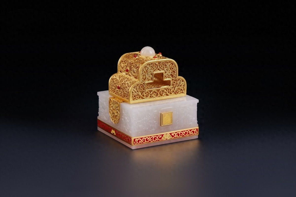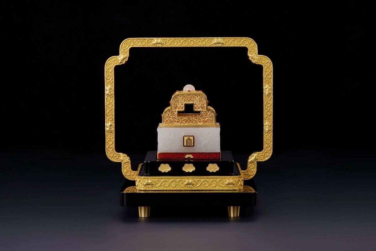 “百年宝玺”将千年花丝镶嵌工艺与珍贵和田玉完美融合,工艺传承千年,尽显皇家顶级工艺的典雅与尊贵。其设计灵感源自故宫文化经典元素,造型独特,玺钮的线条流畅又充满古韵。宝玺以方正和田玉为玺基,完美体现“天圆地方”传统理念,玺基正方的故宫“金字宫标”,彰显故宫官方权威。