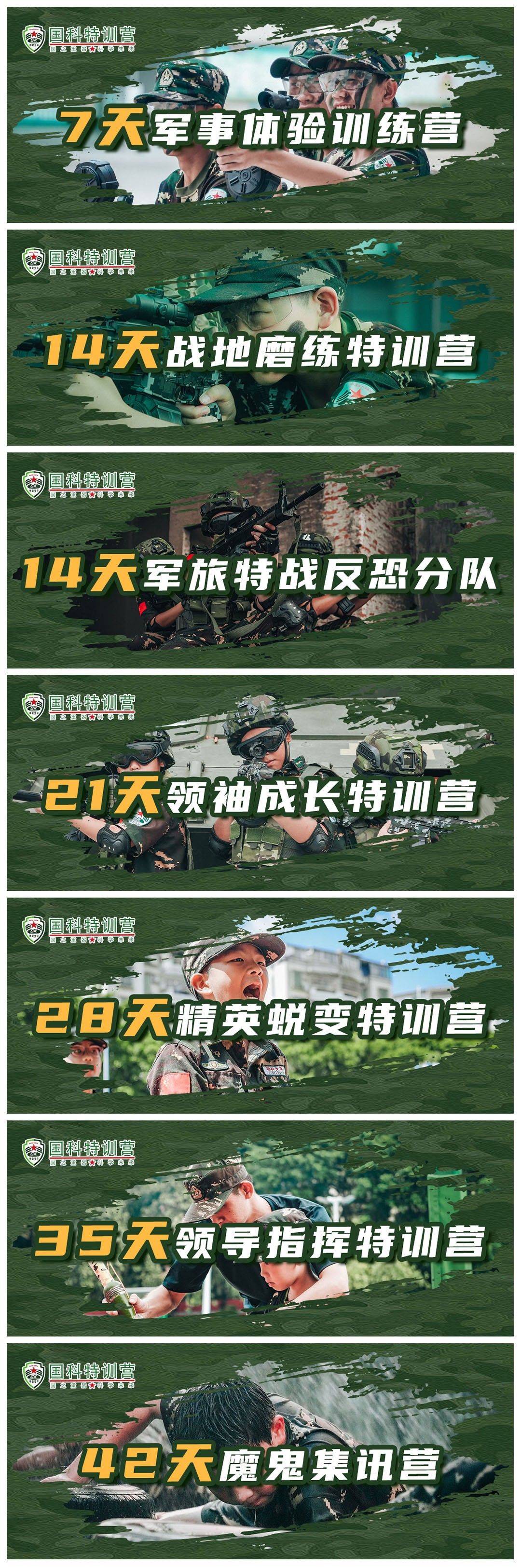 课程分为:7天军事体验营、14天战地磨练营、14天军旅特战反恐分队、【重点推荐】21天领袖成长特训营、【重点推荐】28天精英蜕变特训营、35天领导指挥特训营、42天魔鬼集训营。