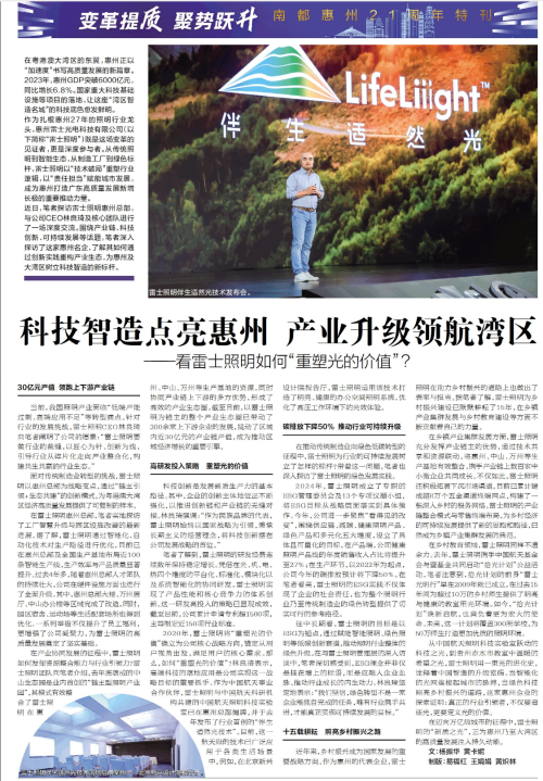 在粤港澳大湾区的东翼,惠州正以“加速度”书写高质量发展的新篇章。2023年,惠州GDP突破6000亿元,同比增长6.8%。国家重大科技基础设施等项目的落地,让这座“湾区智造名城”的科技底色愈发鲜明。 作为扎根惠州27年的照明行业龙头,惠州雷士光电科技有限公司(以下简称“雷士照明”)既是这场变革的见证者,更是深度参与者。从传统照明到智能生态,从制造工厂到绿色标杆,雷士照明以“技术破局”重塑行业逻辑,以“责任担当”赋能城市发展,成为惠州打造广东高质量发展新增长极的重要推动力量。