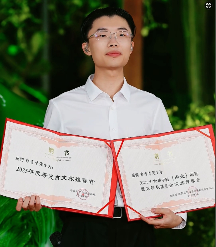 值得一提的是,郭有才在文旅推荐领域同样成绩卓著。此前,他已跟随音乐足迹在全国30多个城市开展文旅推荐活动,凭借出色表现,被10多个城市授予文旅推荐官称号。此次寿光之行,他再次荣获2025年度寿光市文旅推荐官以及第二十六届中国(寿光)国际蔬菜科技博览会文旅推荐官两项殊荣,这无疑是对他在文旅推广方面卓越贡献的高度认可。