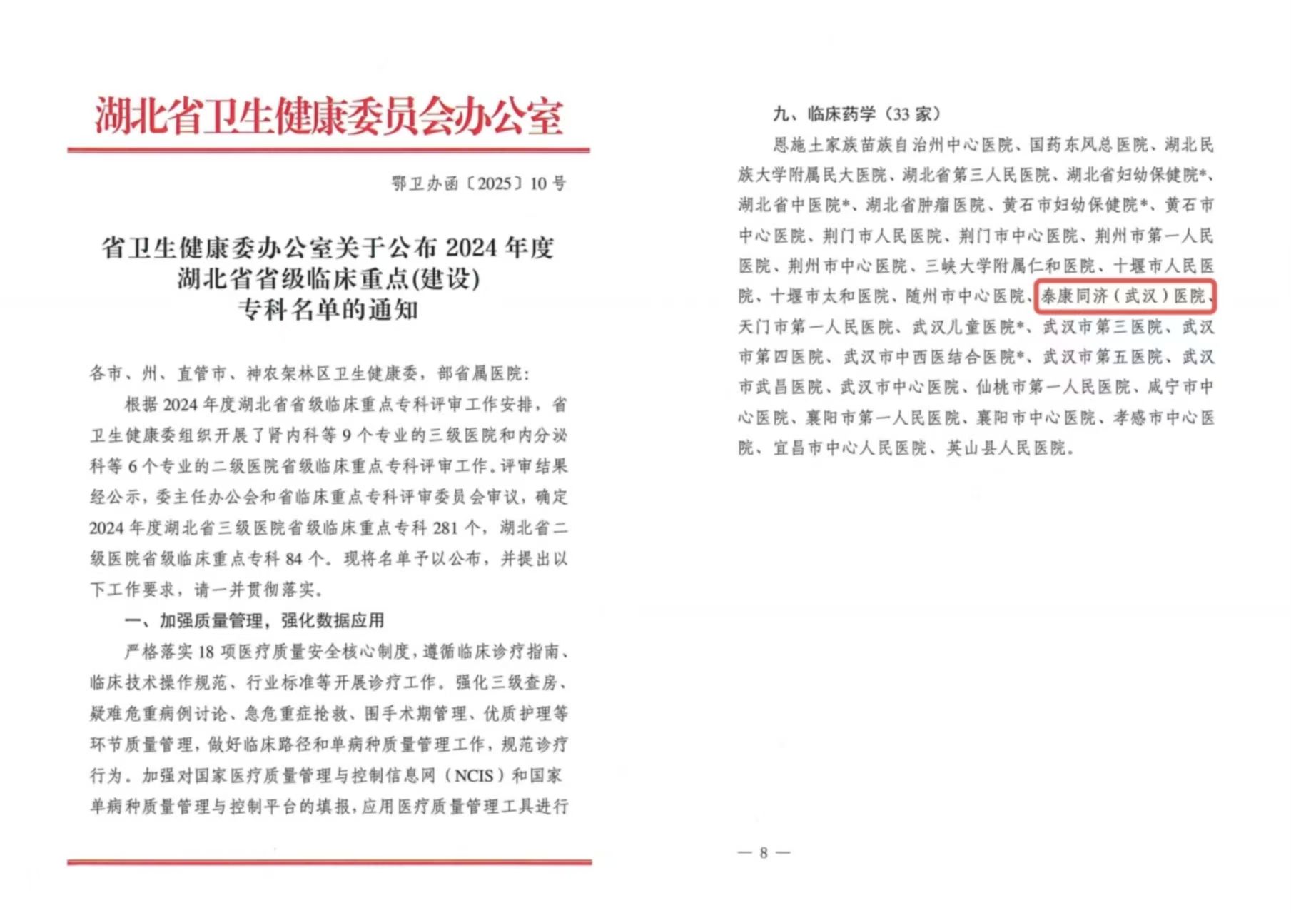 4月7日,湖北省卫生健康委员会办公室正式公布2024年度湖北省省级临床重点(建设)专科名单。泰康同济(武汉)医院药学部凭借卓越的专业实力、优质的服务水平以及在药学领域的深耕细作与持续创新,成功获批省级临床药学重点专科。