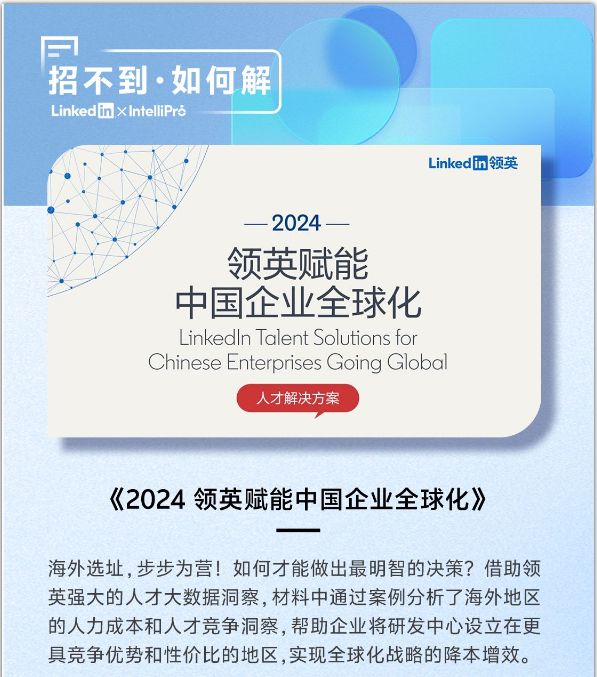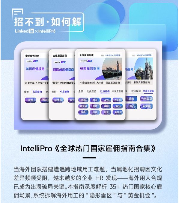 不同于碎片化的市场资讯,LinkedIn 与 IntelliPro 联合打造的「出海人才引力计划」以 6 份深度报告为战略罗盘,围绕「招到人-吸引人-留住人」三大维度,帮助企业快速搭建全球化合规人才战略!