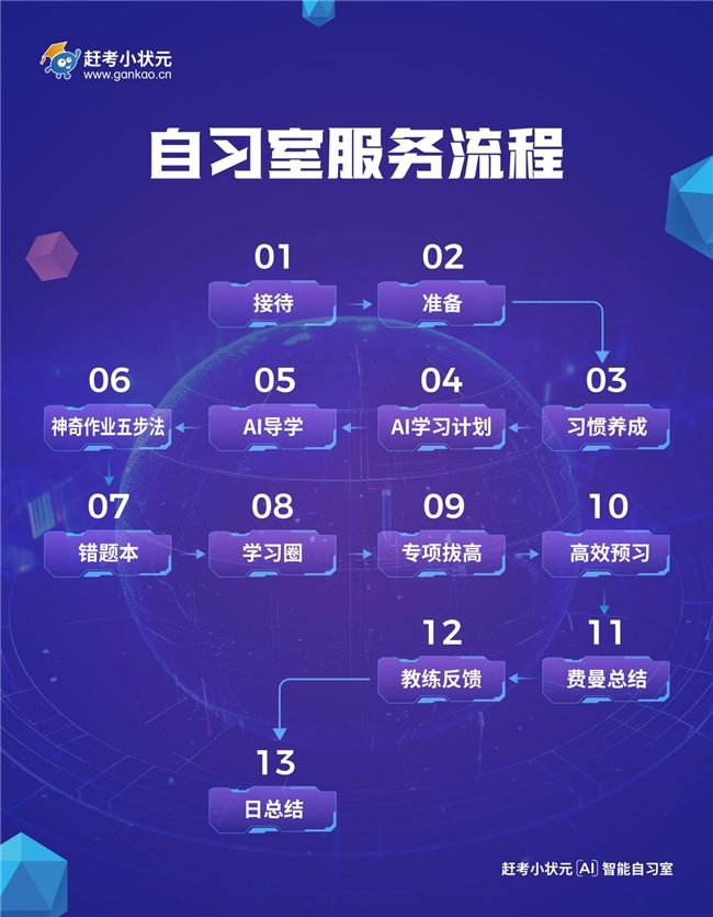 AI自习室是我们在中小学教育领域推出的创新服务模式,它融合了AI设备的前沿技术与启迪教练的细致陪伴服务,旨在为孩子们打造一个既科学又充满人文关怀的学习环境。在AI自习室中,启迪教练扮演着至关重要的角色,他们遵循一套完整的SOP(标准操作流程),包含13个细致入微的服务步骤。孩子进入自习室后,首先会接受启迪教练的深度沟通,以建立信任与共鸣。随后,教练会引导孩子培养良好的学习习惯,如科学的复习与预习方法,确保他们在学习的道路上稳步前行。