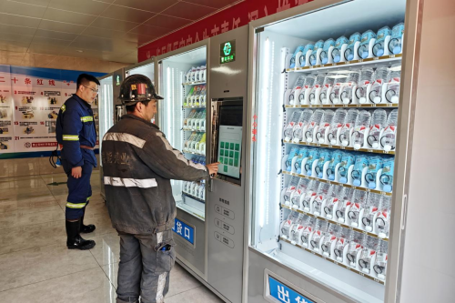 经过多方研讨,瑞能煤业创新采用“智能化+人性化”模式,在井口投用智能发放机。设备内置恒温系统,可存放面包、泡面、饼干、鸡腿等即食食品,以及八宝粥、矿泉水、功能饮料等饮品,职工只需刷脸即可免费领取。为确保食品安全,后勤部门每日根据领取数据动态补货,并设立职工监督岗收集反馈意见。