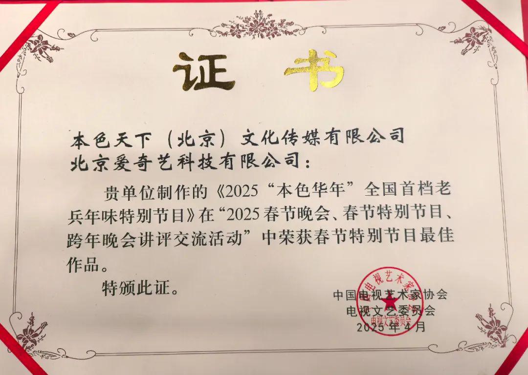 在活动中,由本色天下文化传媒,爱奇艺联合出品的《2025本色华年全国首档老兵年味特别节目》获得春节特别节目类最佳节目奖,这也是《本色华年》节目组第二年获此殊荣。节目总制片人,总导演周炜受邀出席活动,领奖并做以《探寻绿色背影致敬本色人生》为题的主旨发言。