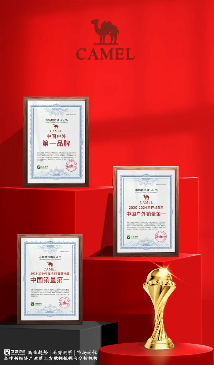 基于艾媒自主研发并获得省部级重大科技专项立项的CMDAS大数据系统监测及严格的调查,以及对中国(不含港澳台)户外、露营帐篷市场研究比对的结果进行统计确认,骆驼荣获全球领先的新经济产业第三方数据挖掘和分析机构iiMedia Research(艾媒咨询)授予的“2020-2024年连续5年中国户外销量第一”“2022-2024年连续3年露营帐篷中国销量第一”“中国户外第一品牌”三项市场地位确认。