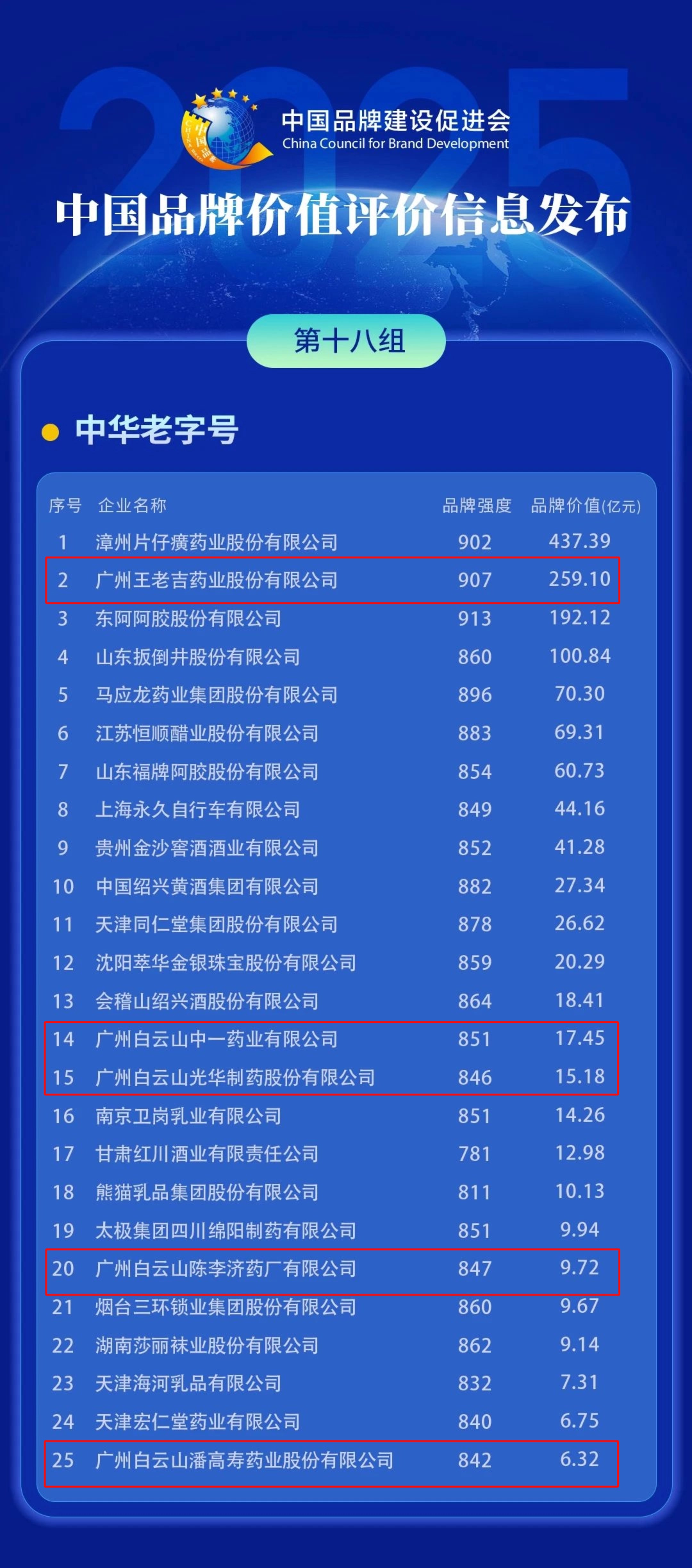 图说:广药白云山旗下多家老字号品牌入选2025中国品牌价值评价信息中华老字号品牌榜单