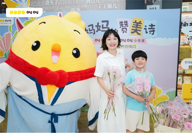 除了诗歌创作,活动还设置了两个温馨的互动环节。在 “写下妈妈的名字” 环节,孩子们在诗歌卡片第一行郑重写下妈妈的名字,一笔一划中饱含对妈妈的深情;在 “以诗换花” 环节,完成拼贴诗的孩子们可领取一支鲜花,亲手送给妈妈,将文字中的爱化作实际行动传递出去。活动期间,身着传统襦裙的“叫叫小诗人”人偶惊喜现身,鼓励小朋友们勇敢走到台前,大胆表达对妈妈的爱。