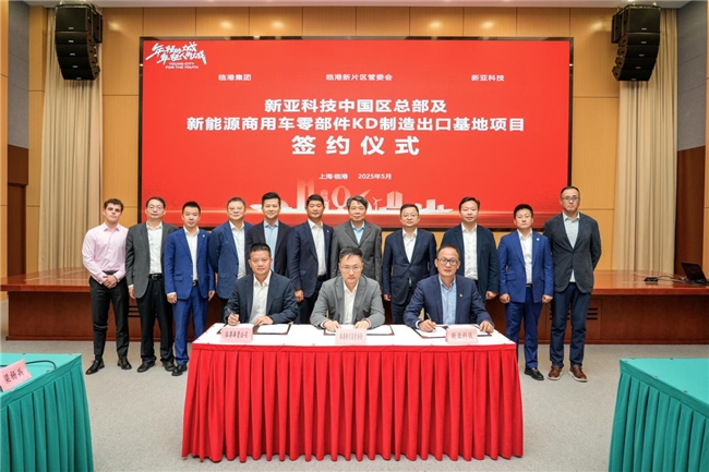 2025年5月8日,新亚科技与中国(上海)自由贸易试验区临港新片区管理委员会(以下简称“临港新片区管委会”)共同签署“新亚科技中国区总部及新能源商用车零件部KD制造出口基地项目”投资协议,新亚中国总部、全球研发中心及KD基地正式落户上海临港。