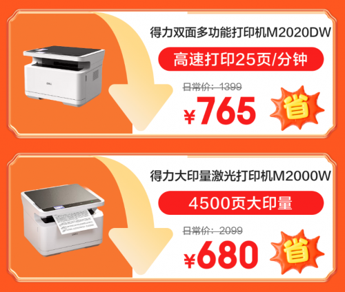 想要入手打印效率更高的产品,得力打印机就是合适的选择。得力双面多功能打印机M2020DW,采用一体式操作面板,并拥有2.4英寸彩色大屏,全中文界面提示上手更简单。可通过微信小程序直连打印,微信群作业可直接轻松打印,还支持自动双面打印,打印速度达25页/分钟,打印文件和作业更高效。京东心动购物季活动期间到手价765元,以旧换新可再减100元。还有得力大印量激光打印机M2000W,其内置硒鼓印量高达4500页,同样拥有2.4英寸彩色屏幕,打印、复印、扫描流程简单,轻松满足家庭成员打印所需,京东价限时降至680元。