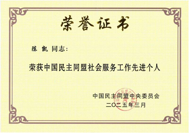 2025 年 3 月 23 日,民盟中央社会服务工作会议在湖北宜昌召开。第十三届民盟中央社会服务委员会秘书长、中华遗嘱库创办人陈凯获 “中国民主同盟社会服务工作先进个人” 称号。