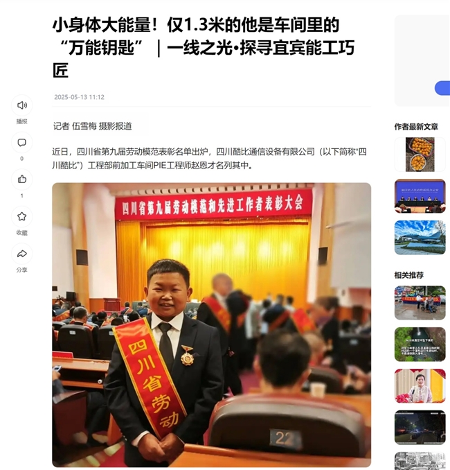 近日,一篇题为《小身体大能量!仅1.3米的他是车间里的“万能钥匙”》的报道刷屏网络,主人公赵恩才的故事让无数网友深受触动:身高 1.3 米的他在车间扎根 7 年,从实习生成长为能工巧匠,被同事称为 “万能钥匙”。就在不久前,赵恩才刚在 2025 年 5 月 7 日举行的四川省第九届劳动模范和先进工作者表彰大会上荣获 “四川省劳动模范” 称号,这一全省劳动者的最高荣誉,让他的名字走进了更多人的视野。带着对这位 “95 后” 省劳模的好奇,我们进行了深入探访,发现其背后不仅是一段励志的个人成长史,更勾勒出一家智能终端企业以人才为基、创新驱动的发展图景。