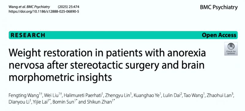 2025年5月12日,国际知名期刊《BMC Psychiatry》(中科院2区,影响因子3.4)在线发表了上海交通大学医学院附属瑞金医院功能神经外科孙伯民教授团队联合多学科研究团队的原创性研究成果《Weight restoration in patients with anorexia nervosa after stereotactic surgery and brain morphometric insights》。该研究首次通过立体定向手术结合脑形态学分析,揭示了神经性厌食症(Anorexia Nervosa, AN)患者体重恢复的神经机制,为这一致死率极高的精神疾病提供了创新性治疗路径。