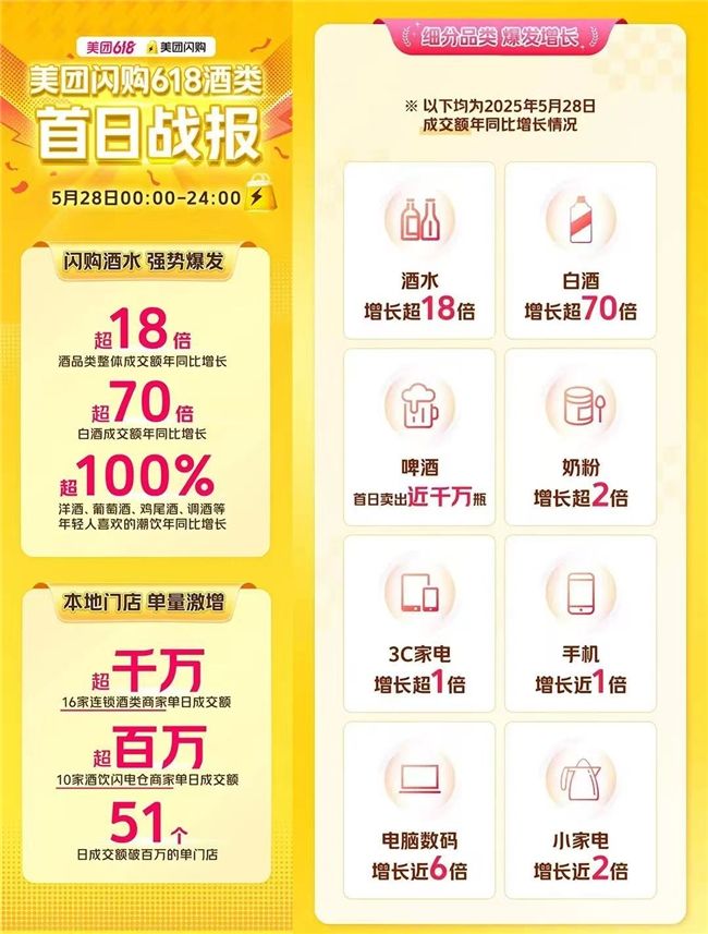 5月29日,美团闪购发布618首日战报,24小时内平台整体成交额相比去年同期增长两倍,酒类呈现爆发式增长,首日成交额相比去年同期涨超18倍。