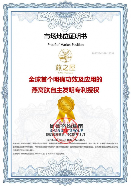 图:燕之屋获得“全球首个明确功效及应用的燕窝肽自主发明专利授权”认证
