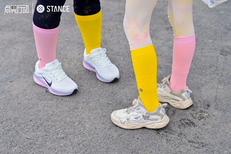 公益跑中,参与者穿着由STANCE与点亮行动公益计划共同打造的特别联名“错袜” Diversity socks系列产品——左右图案不对称,色彩自由跳跃,打破视觉定式,释放多元表达。每一步奔跑,都是对“多样性”的支持与致敬。