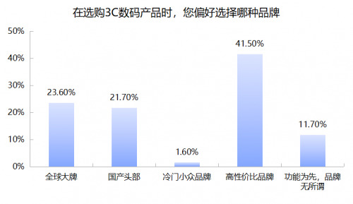 在选购3C数码产品时,相比以往品牌因素占比较高,更多消费者开始优先考虑高性价比品牌。调查结果显示,高性价比品牌偏好占比达到41.5%,其次才是全球大牌和国产头部品牌。