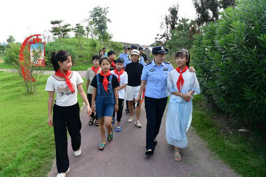 河集派出所所长张春丽带队巡逻,边巡逻边和小学生讲解安全防范常识