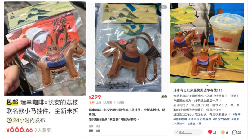 瑞幸果蔬茶配套周边“努力鱼”和“聪明鱼”发条玩具上线约50万件,两天即售罄。据记者在闲鱼二手平台上观察,其转卖溢价超原价3倍。而荔枝冰萃系列的配套周边千荔马挂件被网友称为“转运小马”,首批三天基本售罄,热度几乎等同于潮玩品牌Labubu。目前,瑞幸发布补货通知,表示正在制作新的小马,下周将在部分城市门店上线。