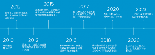 事实上,陶朗食品在AI领域的探索与实践由来已久。自2010年起。陶朗便开启了人工智能与食品安全和运营效率的探索之旅。凭借 50 多年来在全球业务中积累的丰富经验与雄厚技术底蕴,陶朗在食品 AI 分选领域始终处于引领地位。从 2010 年 开展聚类算法研究,到 2015 年推出支持客户本地训练机器学习模型的高分辨率分级平台 Spectrim,再到2018年推出基于深度学习的水果分选系统LUCAi™,并陆续应用于多种水果,陶朗持续不断地进行技术创新与迭代。目前,几乎所有陶朗设备都已搭载 AI 技术,为全球食品企业提供了精准、高效、智能的分选解决方案,成为行业内 AI 应用的标杆。