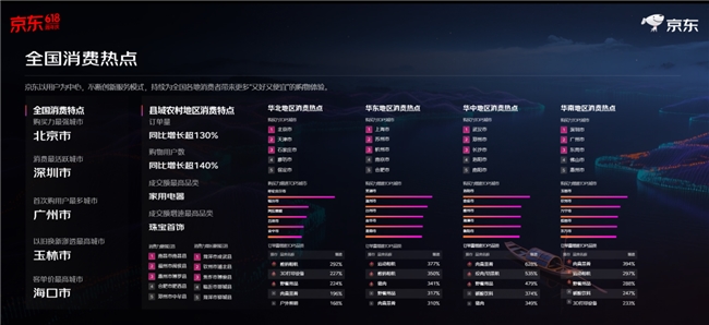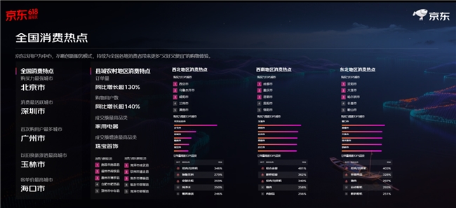 这个京东618,县域农村地区的消费非常活跃,订单量同比增长超130%,购物用户数同比增长超140%,家用电器成交额最高,满足消费者生活品质提升需求,而珠宝首饰则成为增速最快的品类,揭示出农村消费升级和情感型消费的崛起。