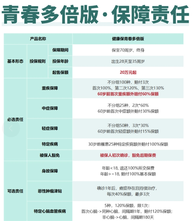 健康保青春多倍版对30岁前确诊的25种特定疾病提供双倍保额赔付。少儿白血病、严重川崎病额外再赔100%,成年过渡期不“断保”,宝妈留言区的粉丝都说:给娃保到30岁太香了!青春期到适婚期都被覆盖。
