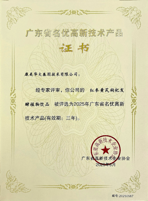 2025年7月1日,广东省高新技术企业协会公布了2025年第一批广东省名优高新技术产品名单,康美华大自主研发的红参黄芪枸杞发酵植物饮品凭借卓越的技术创新能力和市场表现成功入选,彰显了企业在中医药食养领域的领先实力。