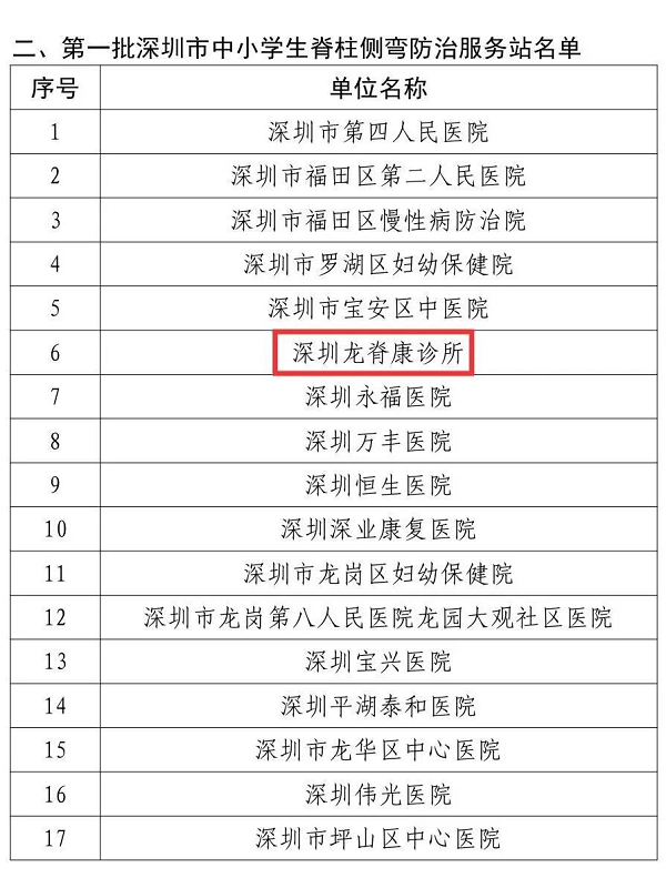 入选第一批深圳市脊柱侧弯康复治疗服务站