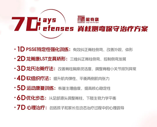 “龙脊康脊柱侧弯7D疗法”是由龙脊康脊柱学院院长、龙脊康首席专家沈彤教授,携手龙脊康资深专家团队,结合13年临床经验研发而成。