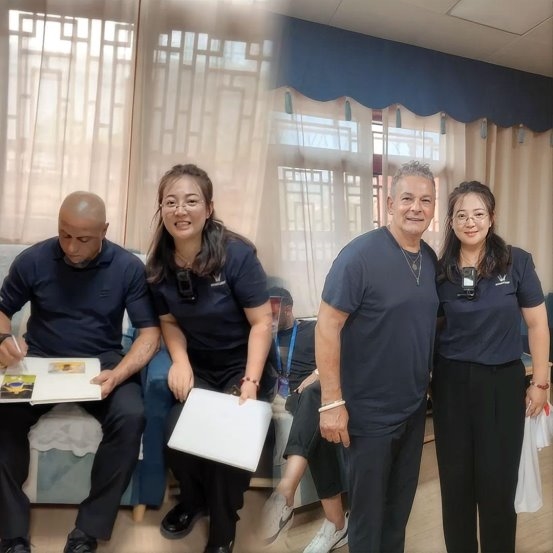 国际著名球星罗伯托·卡洛斯(巴西)与罗伯托·巴乔(意大利),26日空降贵州“村超”现场。会前与威腾体育总经理张妍女士合影留念。