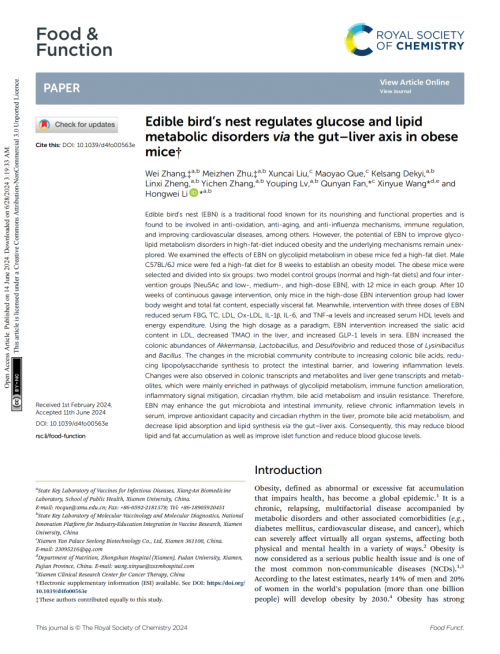 研究论文“Edible bird's nest regulates glucose and lipid metabolic disorders via the gut–liver axis in obese mice(食用燕窝通过肠-肝轴调节肥胖小鼠的糖脂代谢紊乱)”④