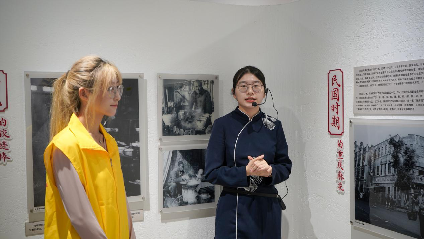 麻花飘香里的百年传承——志愿服务团首站抵达陈昌银麻花博物馆。在讲解员的细致介绍下,成员们了解到陈昌银麻花从清末民初的小作坊起步,历经百年传承与创新,成为重庆非遗美食代表的发展历程。随后,团队成员与麻花制作师傅展开深入访谈,详细记录了传统麻花“选料—揉面—发酵—搓条—油炸”的全流程技艺,尤其是师傅们“三揉三醒”保证面质劲道、“七分油温”把控酥脆口感的独家秘诀,直观感受到非遗技艺中蕴含的匠心与智慧。