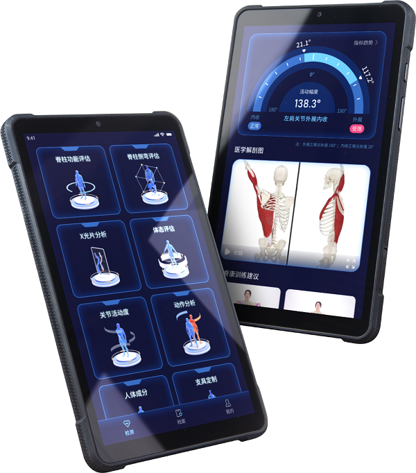 无论是颈椎转动幅度、腰椎弯曲角度,还是肩关节、膝关节的活动范围,AI平板都能实时检测: