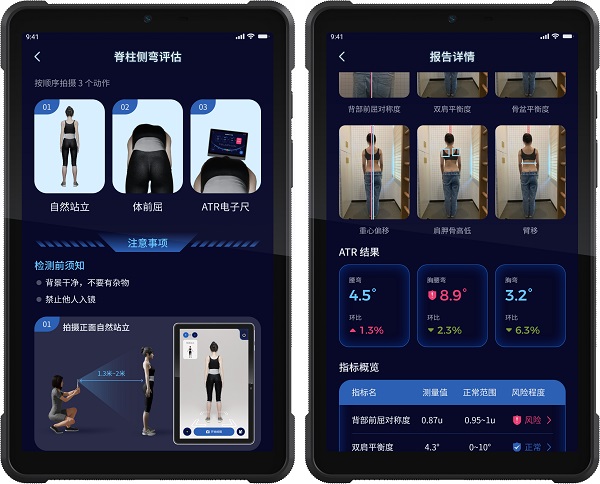 · AI算法+电子测量双重验证:基于3万+脊柱侧弯临床样本训练的AI模型,结合ATR电子测量(精准到腰弯、胸弯角度),输出6项侧弯风险指标;