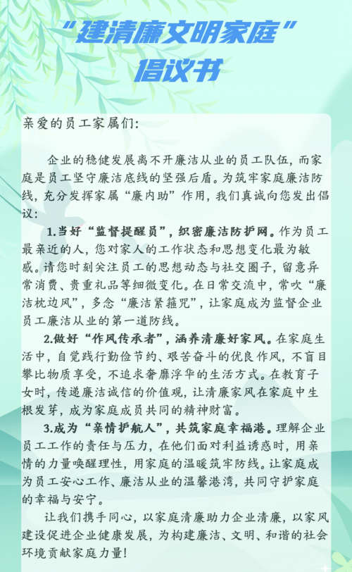 公司开展“树清廉家风,建廉洁家庭”家庭助廉活动,向职工及家属发放廉洁倡议书,倡导家属当好“廉内助”“监督员”,共同营造“以廉为荣、以贪为耻”的家庭助廉氛围,筑牢家庭拒腐防变防线。干部职工及家属深刻认识到家庭在党风廉政建设中的“第一道防线”作用,并表示将共同建设廉洁和谐家庭。