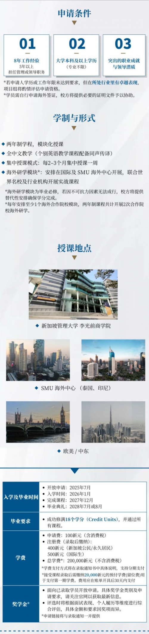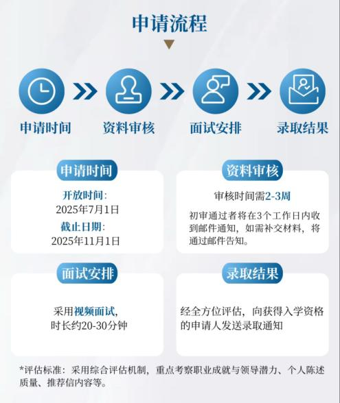 申请条件需满足8年工作经验(其中5年以上管理或领导职务)、大学本科及以上学历等条件,特殊情况可酌情评估。项目学制为两年,采用模块化授课形式,集中授课并包含海外研学模块,合理的安排让学员能够在不影响工作的前提下完成学业。同时,项目还为已录取学员提供奖学金机会,根据面试表现等综合评估,减轻学员的学费负担。