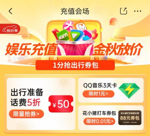 国庆中秋假期将至,无论是准备宅家娱乐,还是打算外出游玩,都不要忘记提前充好话费,同时搞定视频、音乐、运动等APP会员充值,提升宅家或出游的舒适度。为让消费者一站式轻松办理话费充值等业务,京东推出“娱乐充值 金秋放价”主题活动,用户可1分抢出行券包,限量抢券5折充话费。感兴趣的消费者可到京东APP搜索“国庆放价”进入活动页面,提前为手机充话费,同时省钱办理视频、音乐等各类APP会员。下面一起来看看有哪些优惠吧。