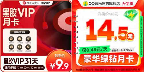 来京东同样可以办理音乐会员,在家、在路上,随时享受音乐。其中,网易云音乐黑胶VIP月卡到手价9.9元,QQ音乐豪华绿钻月卡到手价14.5元。