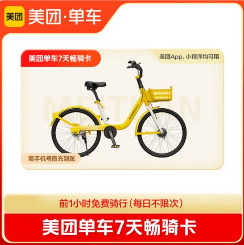 假期出行,用共享单车有时更方便。可以到京东办理一张美团单车7天畅骑卡,每次骑行前1小时免费(每日不限次),到手价8.5元。