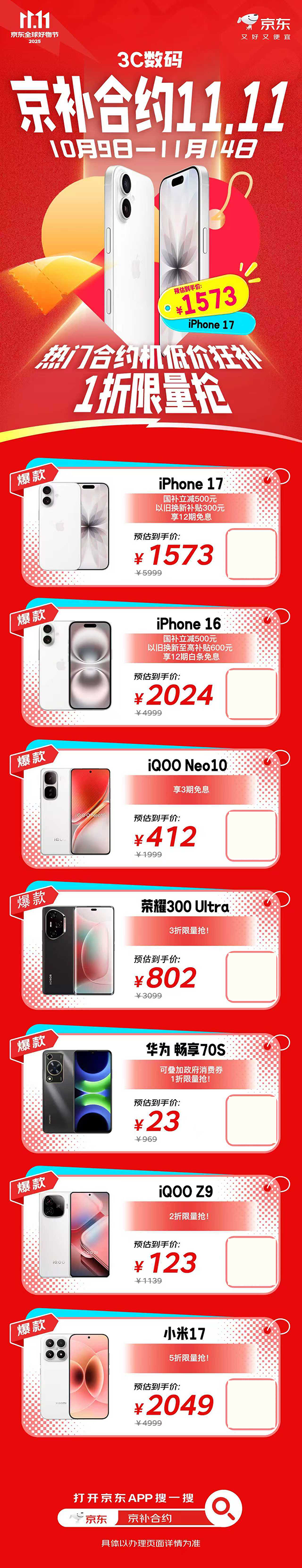 iPhone 17享国补立减500元叠加京补合约补贴,预估到手价1573元,还可享以旧换新补贴300元、12期免息。iPhone 16享国补立减500元叠加京补合约补贴,预估到手价2024元,可享以旧换新至高补贴600元、12期免息。iQOO Neo10享京东合约补贴,预估到手价412元,还可享3期免息。荣耀300 Ultra可享京补合约补贴,3折限量抢,预估到手价802元。华为 畅享70S享京补合约补贴叠加政府消费券,1折限量抢,预估到手价23元。iQOO Z9享京补合约补贴,2折限量抢,预估到手价123元。小米17享京补合约补贴,5折限量抢,预估到手价2049元。