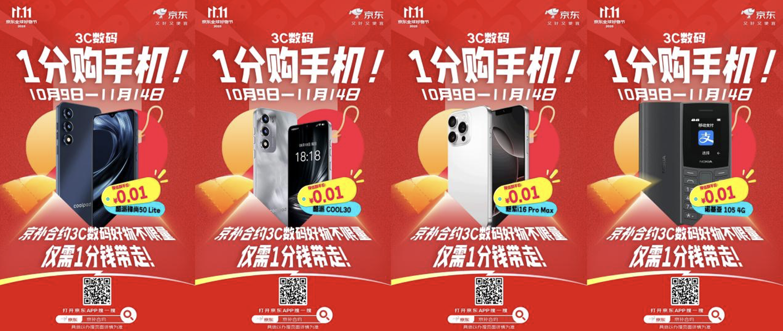 京东“京补合约”11.11还为消费者准备了不限量3C数码好物,仅需1分钱就能带走。其中,酷派锋尚50 Lite、酷派COOL30、魅紫i16 Pro Max、诺基亚105 4G均可享京补合约补贴,低至0.01元。