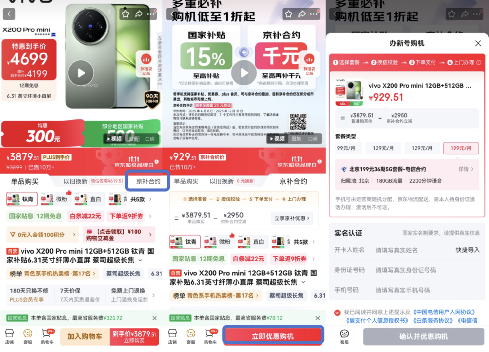 消费者到京东APP搜索想要购买的手机产品,选择京东自营商品,点击商品图下方的“京补合约”,然后点击“立即优惠购机”,就可以选择话费套餐,输入身份信息,勾选办理协议,随后下单就能享受补贴了。线上点几下完成下单后,京东快递小哥将上门协助消费者完成信息核验和套餐激活等流程,一站式搞定新手机、新号卡、新套餐,足不出户就能省钱购机。