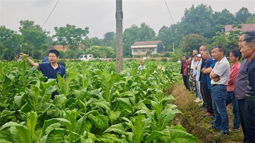 (烟叶技术员对烟农进行田间技术指导 龚嘉摄)