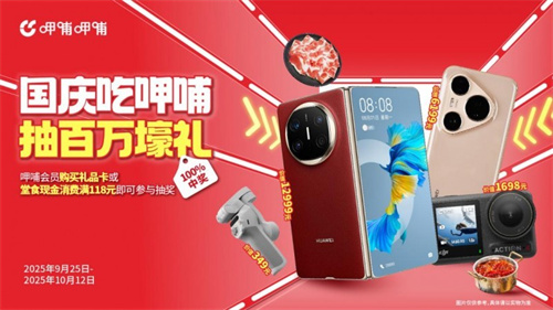 呷哺呷哺通过多维度活动策略,从9月25日至10月15日期间推出八大主题营销活动。活动以"国庆吃呷哺,抽百万壕礼"拉开序幕,会员通过购买礼品卡或堂食现金消费满118元即可参与抽奖,8万份奖品中包含价值12999元的华为手机等重磅好礼。