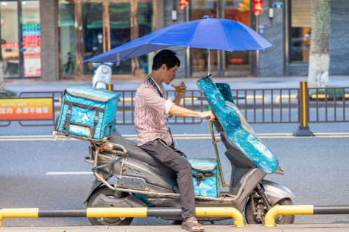 图为外卖骑手饮用红色驿站提供的冰木莲 楼松文/摄