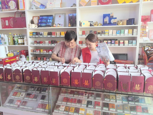 “每年这时候都忙不过来,既要包装喜糖,又要招呼顾客,年纪大了,有点干不动了。”浦江县黄宅镇新大副食部老板娘黄宝凤需要在国庆来临之前准备好婚庆随手礼,她一边和志愿者一起封装喜糖礼盒,一边介绍多年的经验心得。志愿者们不仅分工协助折叠礼盒、分装喜糖,还结合婚庆场景特点,为店铺优化卷烟陈列——将适合婚宴使用的卷烟组合摆放,搭配红色丝带、喜字贴纸打造主题陈列区。“这么一布置,客人一眼就能看到合适的产品,购买意愿也增加了,感谢大家的助力!”黄宝凤看着进店咨询的顾客,脸上满是笑意。