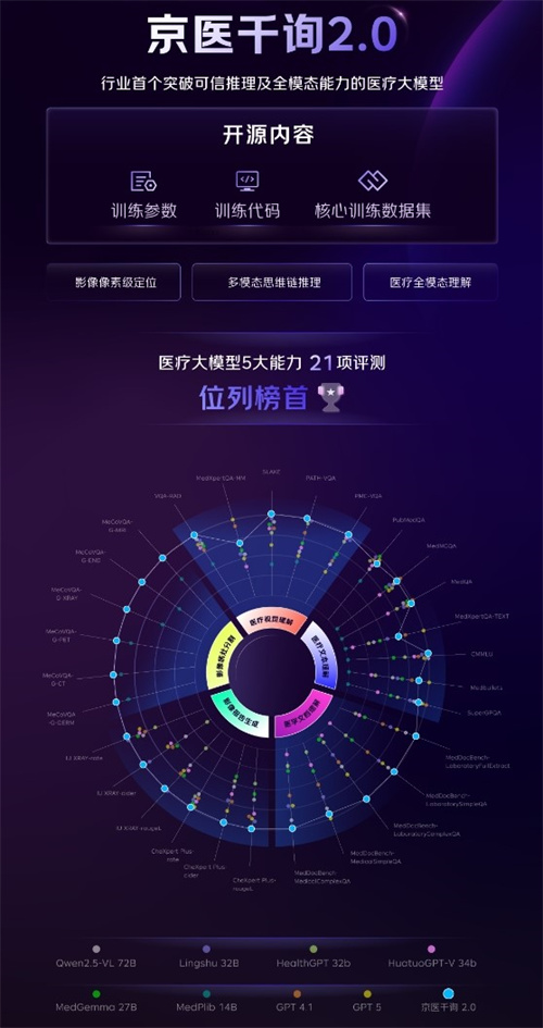 论坛上全新升级的“京医千询2.0”,是行业首个突破可信推理及全模态能力的医疗模型。它能够严格模拟医生临床诊疗思维路径,深度融合医学知识体系与真实诊疗逻辑,在推理过程中主动引入并对齐外部循证医学证据,确保推理符合医学共识,帮助医生更精准地判断复杂病症。